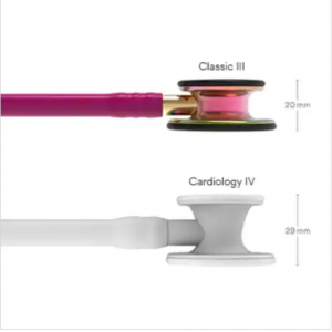 I purchased this 3M Littmann 5806 to use in my pediatric clinic. As these classic III models have dual sided chestpiece I went for this because no pediatric model looked as good as this so I never looked back and the quality is excellent. Raspberry tube was available but with a rainbow finish chestpiece and golden stem this model looks so unique. At first, I was unsure if I was purchasing a real product as I didn’t expect littmann to offer such special colors. Receiving this with my name engraved on the chestpiece seemed like a gift for myself. Many children who come in for checkup were asking their parents if they can have one exactly like this. Also, I appreciate B-Arm team for the engraving and timely delivery and I recommend all pediatricians to go with classic III models instead of classic II as it’s dual sided and also the acoustics are way better in this one.
