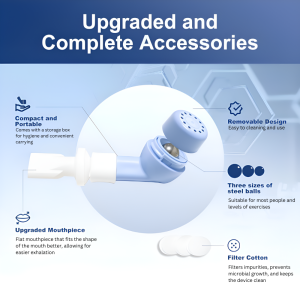 3 RESISTANCE BALLS: The airway clearance device features three resistance balls to provide personalized therapy at different resistance levels, helping to loosen mucus through OPEP technology and facilitating mucus removal through cough, ensuring an effective mucus clearance.