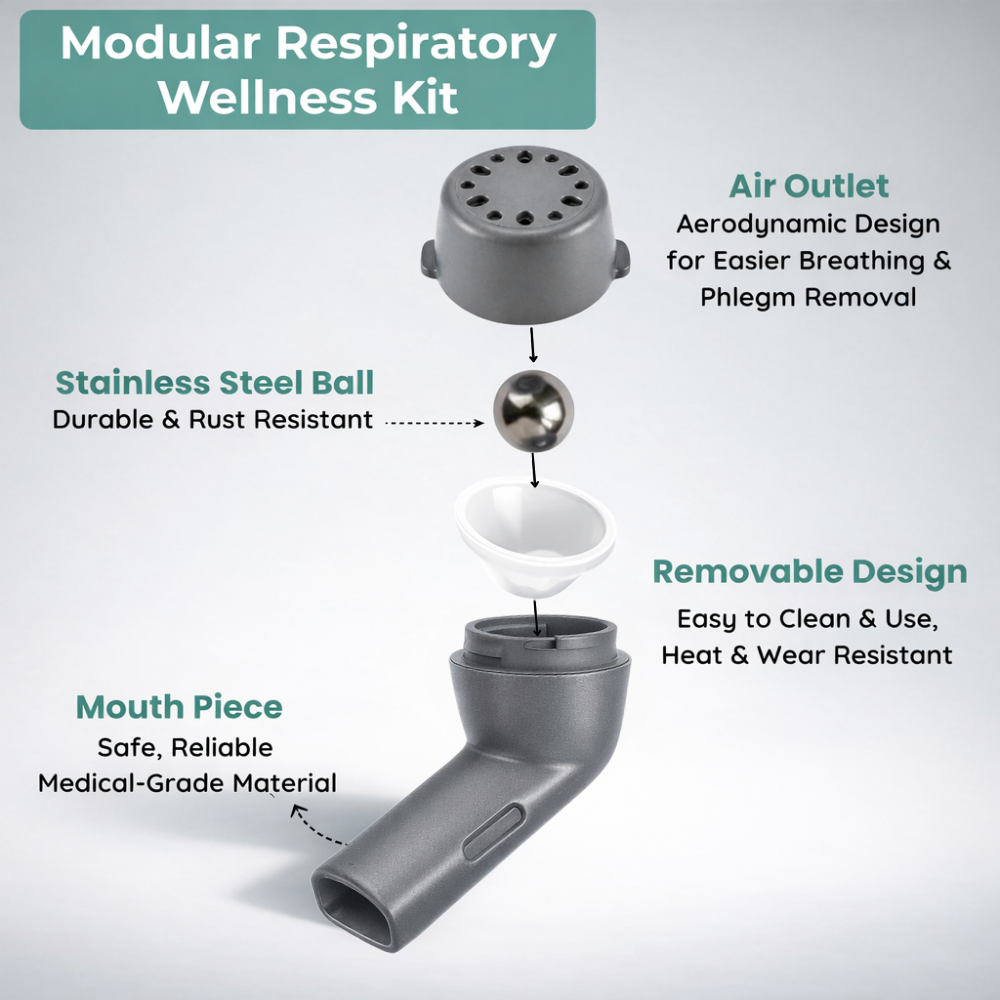 The lung expander or lung trainer, is used to treat respiratory conditions by lung cleanse and airway clearance, improving breathing for individuals with excessive mucus buildup and preventing infections by removing trapped bacteria or viruses. The lung device or breathing exercise equipment also aid in post-surgery recovery by clearing the mucus airways. In addition to devices like asthma inhalers, nose cleaners, nasal aspirators, incentive spirometers, and nebulizer machines that help relieve sinus issues by reducing nasal blockages, our mucus removal device or breathing machine offers a more effective solution for clearing mucus and chest phlegm. Our portable mucus remover or lung breathing exerciser, which is convenient for personal use, is smaller than the mucus suction pump and suction machine, which are used for lung detoxification at hospitals. This lung exercise equipment are beneficial for a wide range of individuals, including adults, elderly, athletes, children, smokers, singers, swimmers, and divers. This mucus remover for adults also functions as a respiratory trainer, helping to strengthen the respiratory muscles.