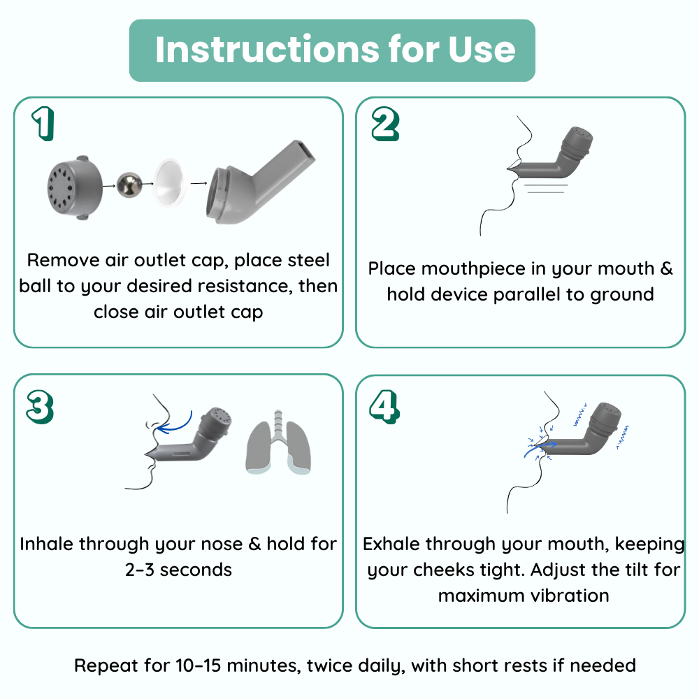 5 RESISTANCE BALLS: The airway clearance device features three resistance balls to provide personalized therapy at different resistance levels, helping to loosen mucus through OPEP technology and facilitating mucus removal through cough, ensuring an effective mucus clearance.