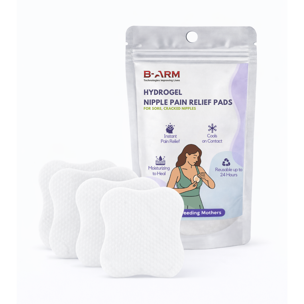 Login / RegisterThis B-Arm Hydrogel nipple pads (Pack of 4) provide instant cooling relief for sore nipples, cracked nipples, nipple blisters, discomfort or nipple pain due to pumping or feeding. These nipple pads create a moist healing environment that promotes faster recovery and maintains skin hydration. These cooling breast pads feature an adhesive design that ensures they stay securely in place. These breastfeeding nipple pads are perfectly shaped to offer maximum coverage, making them comfortable for all breastfeeding women. These cooling gel pads act as nipple protector, which prevents friction between the nipples and clothing, reducing irritation. These hydrogel breast pads provide an instant cooling effect, making them ideal for lactating women experiencing breastfeeding pain. These reusable nipple pads are easy to use, offering comfort and support throughout the breastfeeding journey.
