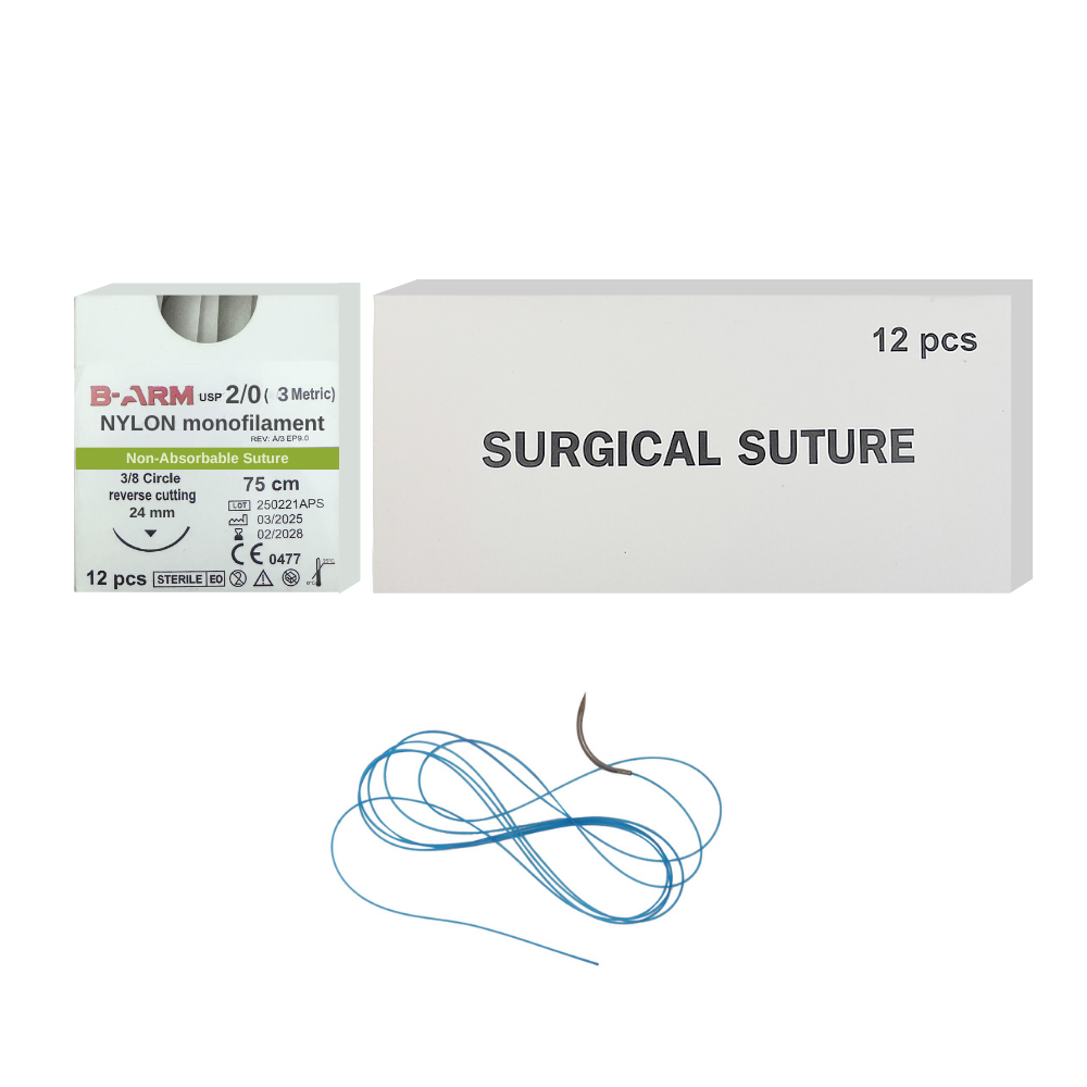 Ans: The B-Arm Nylon Suture Thread 2-0 is a non absorbable, monofilament surgical suture designed for clinical use and medical training. It comes with a 24mm reverse cutting needle for precise tissue handling.
