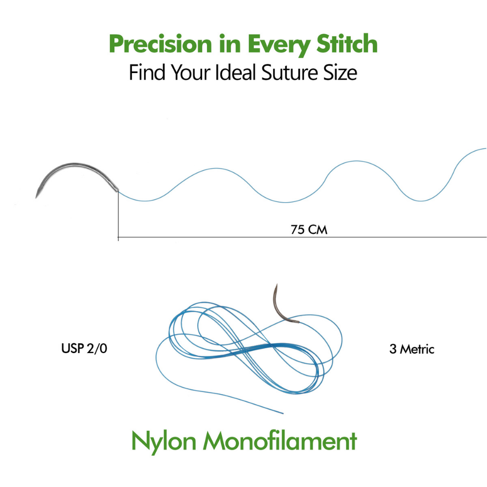 RELIABLE TISSUE CLOSURE THREAD: Our B-Arm Nylon Suture Thread 2-0 (Pack of 12) with 24mm needle is a non absorbable, monofilament surgical suture made from high-grade nylon, ensuring smooth tissue passage, dependable tensile strength, and excellent knot security while minimizing trauma, tissue reaction, and infection risk.