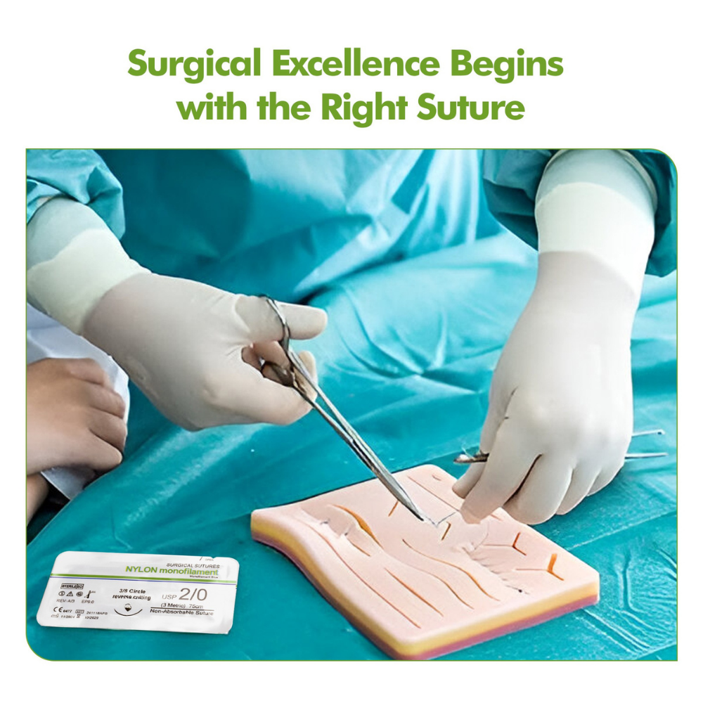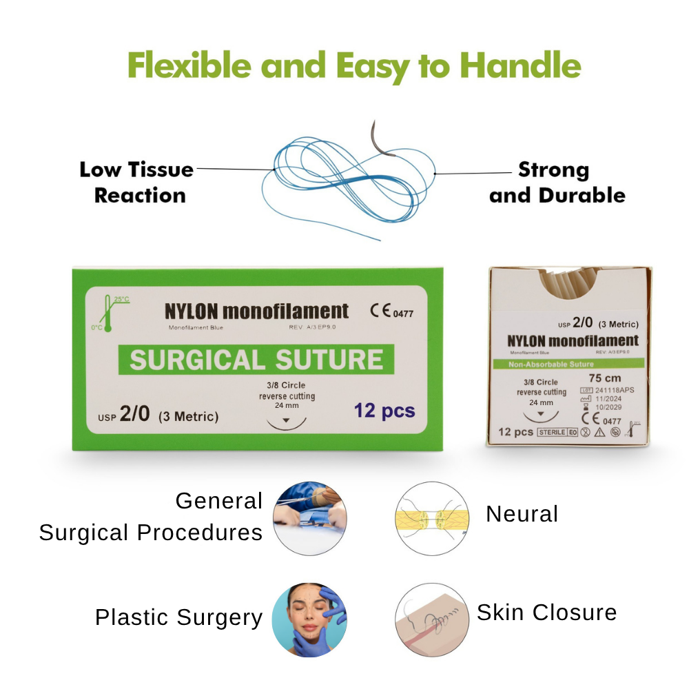 Login / RegisterOur B-Arm Nylon Suture Thread 2-0 (Pack of 12) with 24mm needle is a non absorbable, monofilament surgical suture designed for both clinical use and medical training. Made from high-grade nylon, it ensures smooth passage through tissue, dependable tensile strength, and excellent knot security, while minimizing trauma, tissue reaction, and infection risk. The 2-0 size offers balanced support for medium to deeper tissue approximation, making it suitable for closures of skin, muscle, and fascia, as well as general, dental, plastic, and surgical practice scenarios. Each 75cm suture comes with a sharp 24mm reverse cutting needle (3/8 circle curvature), individually packaged and EO pre-sterilized for aseptic use. CE-certified and manufactured to medical-grade standards, this stitch thread provides controlled handling, long-lasting support during the healing phase, and realistic simulation for medical students learning safe and effective wound closure techniques. With its durability, sterile packaging, and reliable performance, the nylon stitch thread is both an essential addition to surgical kits and a valuable training tool for skill development.
