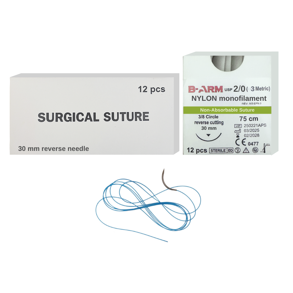 Login / RegisterOur B-Arm Nylon Suture thread 2-0 (Pack of 12) with a 30mm needle is an EO sterilized and CE certified non absorbable monofilament surgical suture made from high-quality nylon (polyamide), specifically designed for medical training and suturing practice. This nylon stitch thread is thick, durable thread provides excellent tensile strength, making it ideal for practicing a variety of techniques such as wound closure, knot tying, and handling high-tension areas on suture pads or training models. This suture thread allows trainees to simulate procedures including abdominal wall closure, orthopedic suturing, and general wound repair in a realistic, hands-on environment. The suture’s strong, non absorbable nature provides consistent tissue support during practice, helping learners develop precision, control, and confidence before performing real surgical procedures.