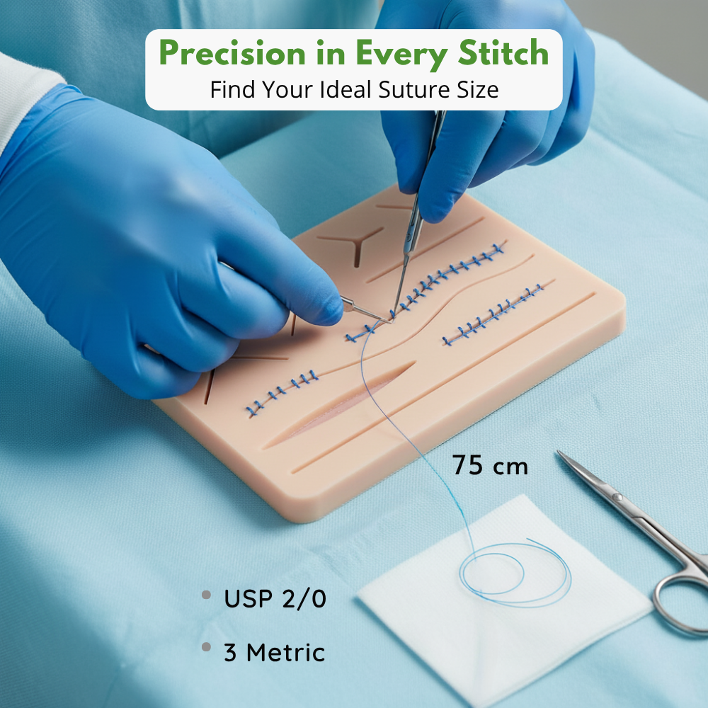 Ans: This suture thread comes with a 30mm needle, designed for precise control and smooth insertion through suture pads and training models.