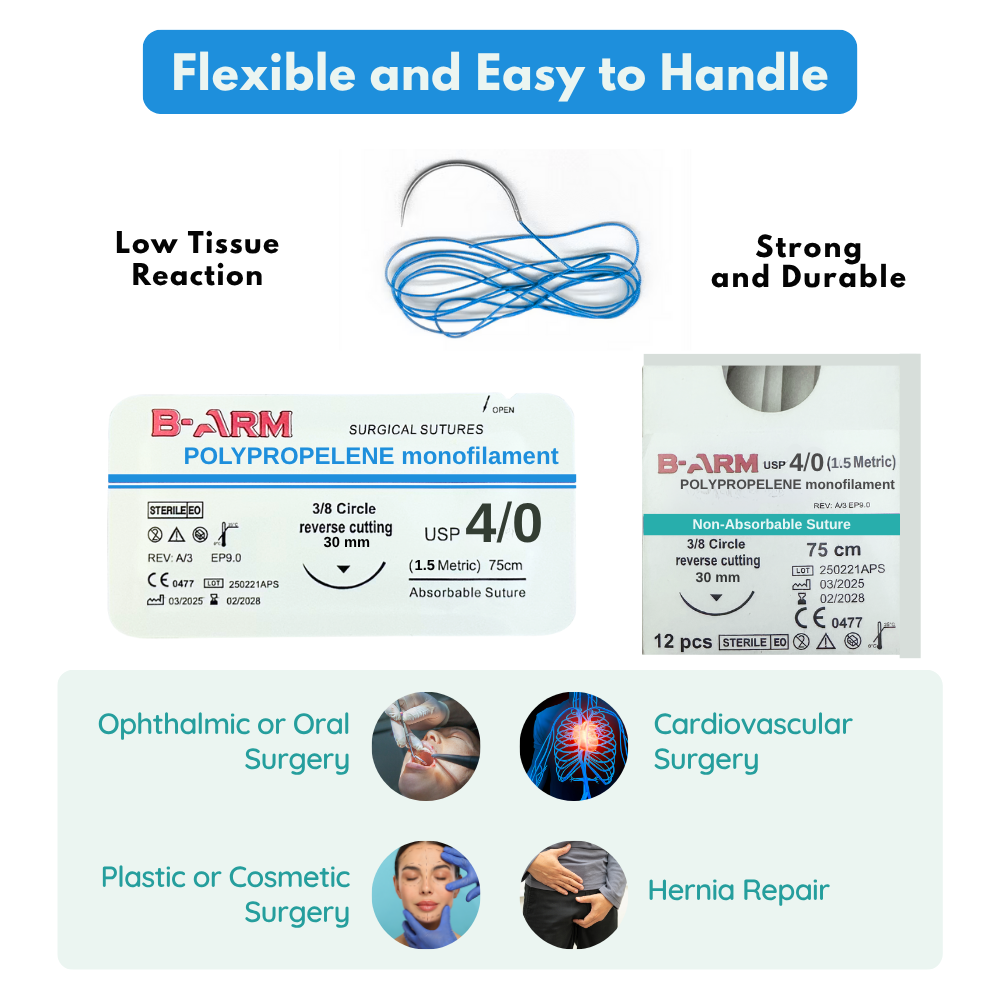 REALISTIC SURGICAL PRACTICE SUTURE: Our B-Arm Polypropylene Suture thread (Pack of 12) USP 4-0 with a 30mm needle is an EO-sterilized, non absorbable monofilament thread designed specifically for medical and surgical training. Its fine, thin structure provides a safe and realistic suturing experience for trainees.