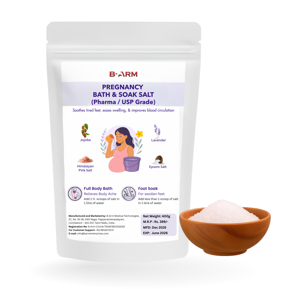 Login / RegisterOur B-Arm Pregnancy Bath & Soak Salt (400g) is a USP-grade/Pharma-grade, naturally occurring mineral made from 100% natural, hypoallergenic pure magnesium sulfate, well-known for its soothing and healing properties, especially beneficial for pregnant women. Enriched with Himalayan Pink Salt for mineral replenishment, Jojoba Oil for deep moisturization, and Lavender Oil for calming aromatherapy, this gentle formulation enhances relaxation, skin health, and overall pregnancy comfort. It is effective for pregnancy care, as it helps relieve body aches, reduce swollen legs, ease sore muscles, and promote restful sleep. With medium-grain crystals that dissolve quickly, these fast-dissolving crystals ensure a smooth, no-residue soak that makes every bath or foot soak effortlessly refreshing. This pregnancy bath salt exfoliates dead skin, detoxifies the body, and supports healthy skin. Free from parabens and phthalates, it is gentle on sensitive skin and helps calm cramps, tension, and promote stress relief. This magnesium salt nourishes stretched skin, reduces swelling, and promotes overall comfort, particularly beneficial for pregnant women during their third trimester. Itching is common during pregnancy as the skin stretches to support the growing baby, and our pregnancy soak salt can provide natural relief and soothing comfort.
