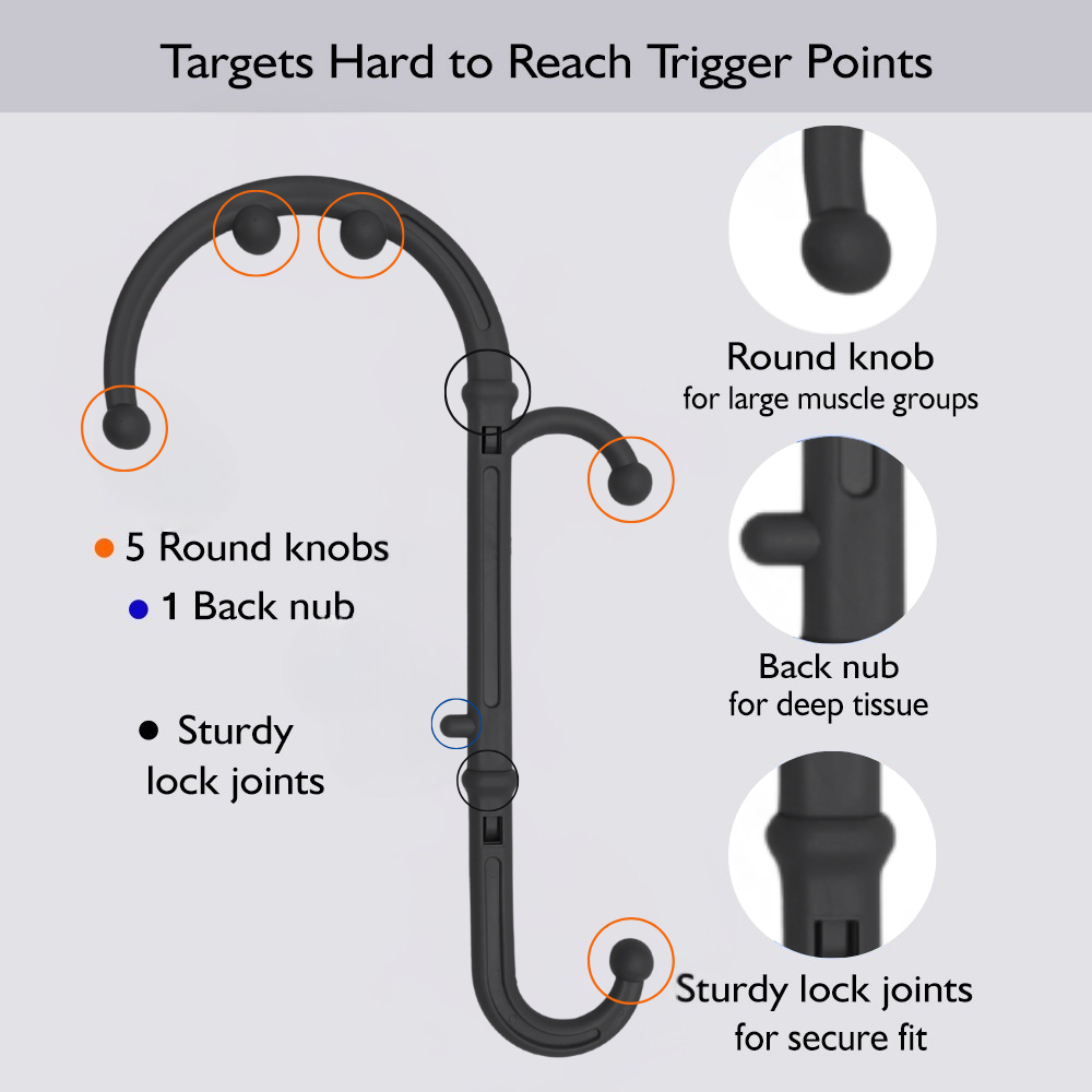 A: The hook shape is better than a regular massagers because it is made from strong, non-slip plastic and provides a secure grip for better pain relief. This body massage tool features six nodes: five knobs for treating larger muscle groups and one nub for more precise and deep tissue massage.