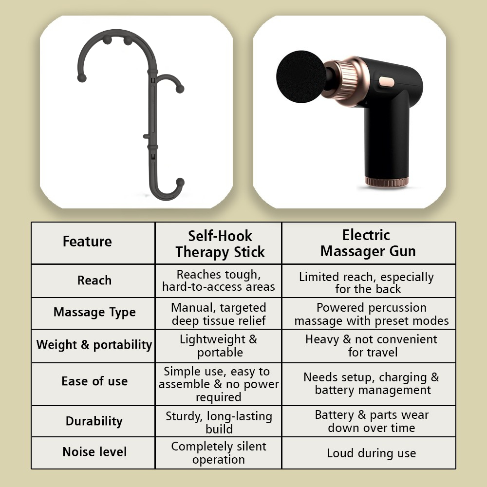 SELF HOOK VS MASSAGE GUN: This back and neck massager provides relief to hard-to-reach areas without the need for power, while the electric massager gun requires charging, is bulkier, and tends to be more expensive.