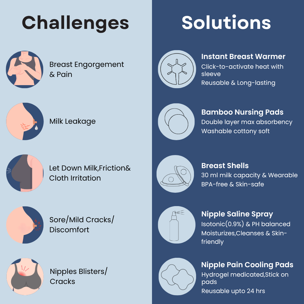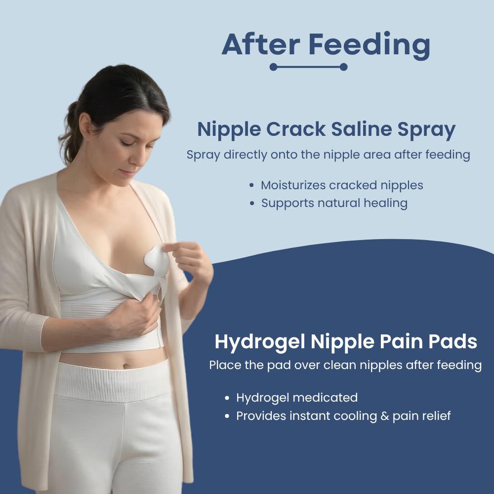 COMBO CONTENTS: Includes Nipple Pain Relief Pads (Hydrogel) – 4 nos, Reusable Nursing Pads – 6 nos, Instant Breast Warmers – 1 no, Breast Shells – 2 nos, and Cracked Nipple Saline Spray.