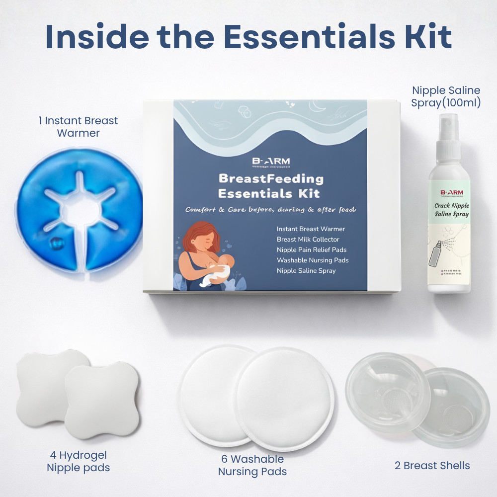 Login / RegisterOur B-Arm Breastfeeding Essential Kit includes Hydrogel Nipple Pads, Cracked Nipple Saline Spray, Reusable Nursing Pads, Instant Breast Warmers, and Breast Shells, carefully combined to support mothers during the early postpartum and breastfeeding period. This all-in-one kit soothes sore and cracked nipples, promotes healing, prevents milk leakage, and relieves engorgement or blocked ducts, ensuring comfort and hygiene. Each product works together to make breastfeeding easier, helping mothers feed confidently and with peace of mind. Unlike standard market combos, the kit is thoughtfully designed to address real early breastfeeding challenges rather than just being a random mix of items.